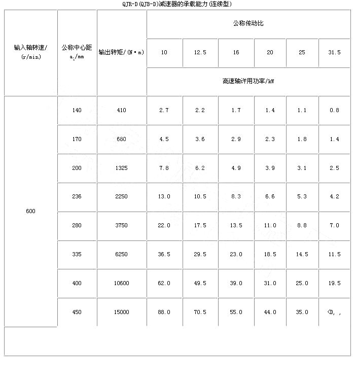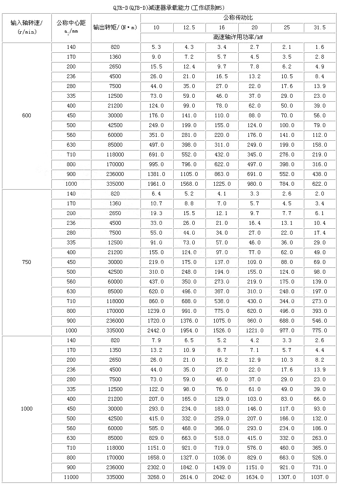 起重機底座式減速器是在三支點減速器的基礎上派生出來的。因此QJ-D型減速器的工作條件、主要技術(shù)參數(shù)、承載能力和輸出軸端最大允許徑向載荷與三支點減速器相同,其它有所不同。